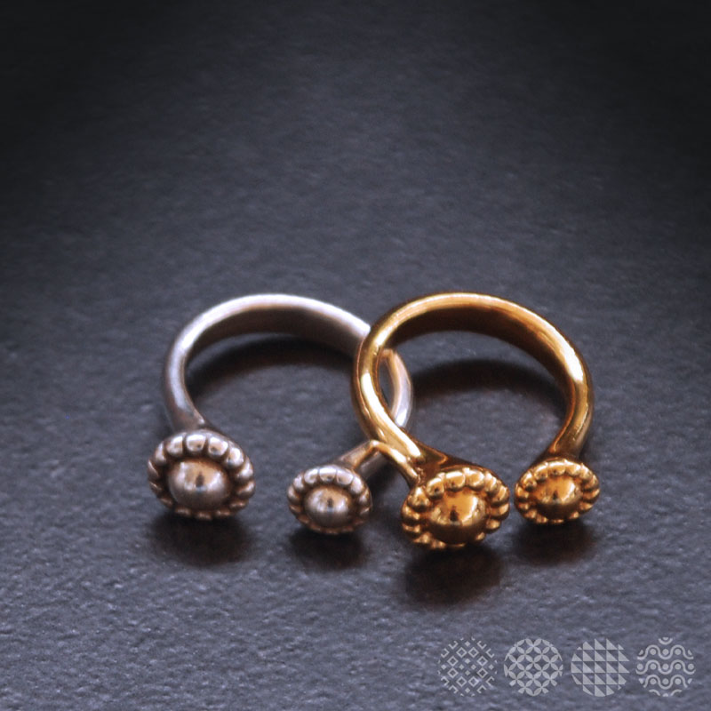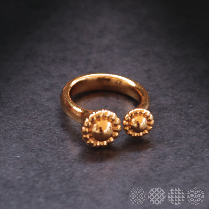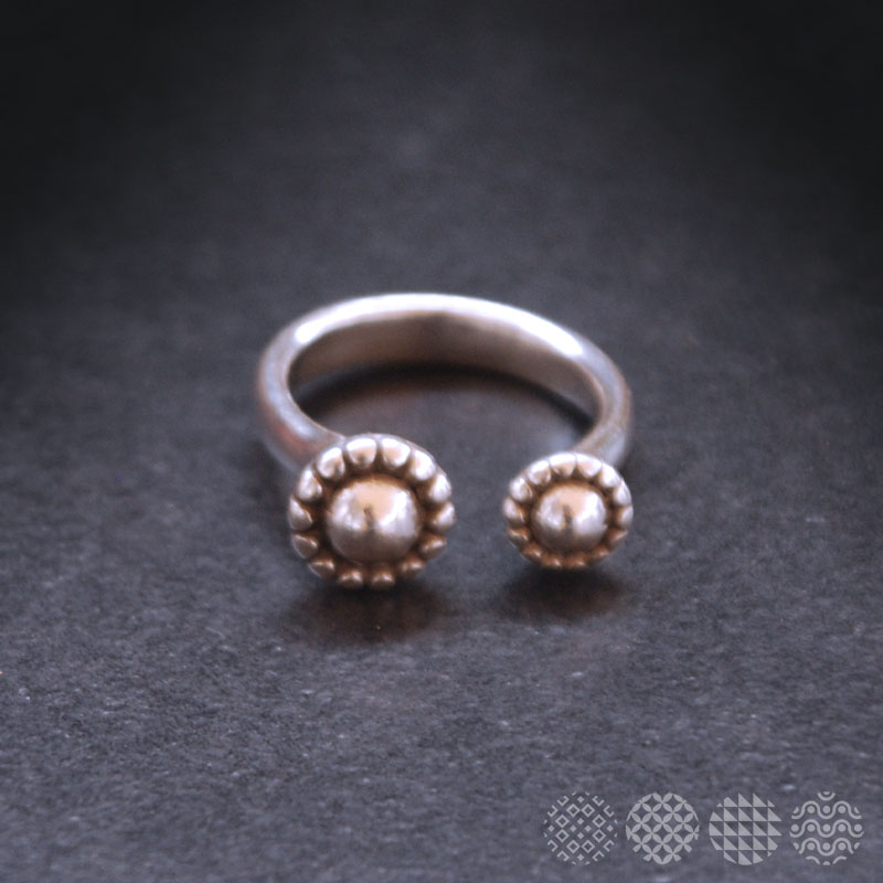 Δαχτυλίδι με γάμπα αυξομειούμενη, με το άνοιγμα από επάνω και διπλό τελείωμα από διακοσμημένα μπιλάκια. Διαθέσιμο σε ασημί και χρυσό χρώμα.
